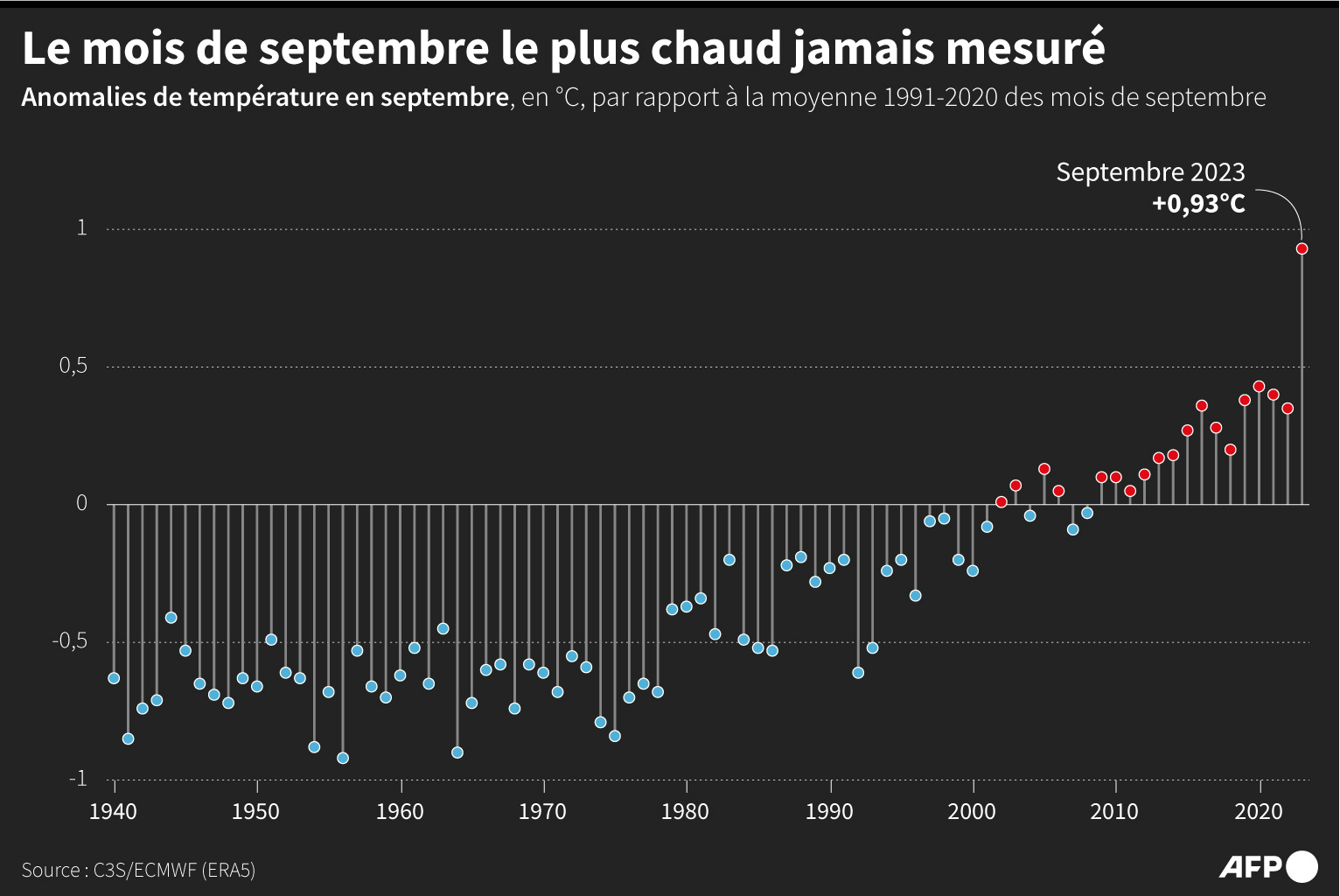 "Septembre 2023 a été le mois de septembre le plus chaud jamais enregistré au niveau mondial", et 2023 est désormais l'année la plus chaude jamais mesurée sur les neuf premiers mois. "Nous n'avons jamais rien vu de tel", commente le directeur de l'observatoire Copernicus, Carlo Buontempo.