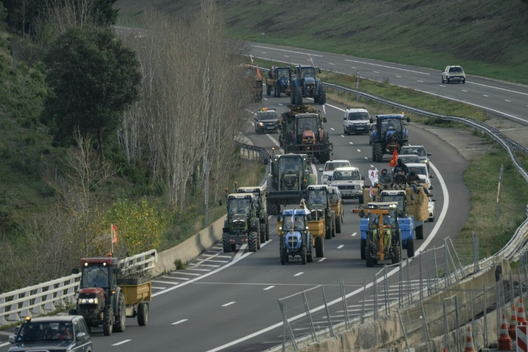 "Tant qu'on n'a pas une réponse de l'État, une réponse concrète, on ne bougera pas", a déclaré Alexandre Garcia membre des JA de l'Aude sur le blocage de l'A61 qui relie Toulouse à la Méditerranée et à l'Espagne, avant qu'un manifestant ne scande "stop à l'abattage et non au Mercosur", entouré de tracteurs.