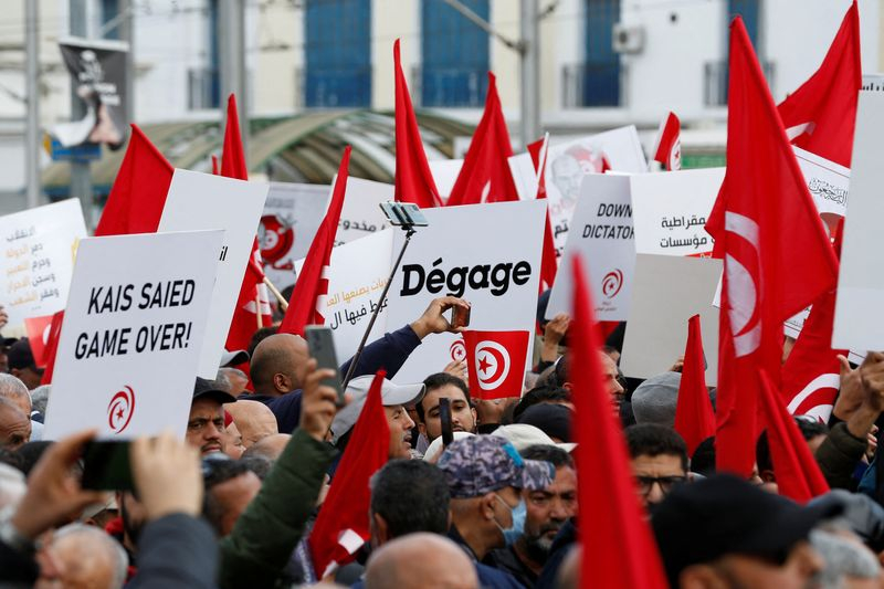 TUNIS (Reuters) - Des milliers de Tunisiens se sont rassemblés samedi à Tunis pour marquer le douzième anniversaire de la chute de Zine el-Abidine Ben Ali et dénoncer la mainmise du nouveau président Kaïs Saïed sur la vie politique du pays, en réclamant sa démission.