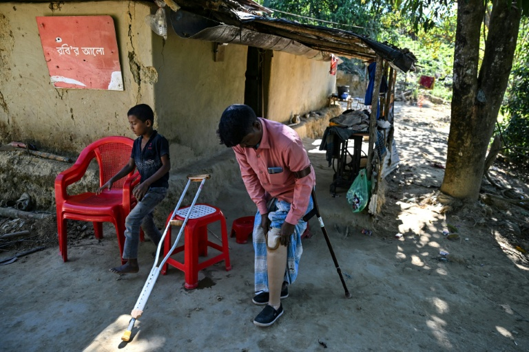 Les chirurgiens ont amputé la jambe d'Ali Hossain au-dessus du genou. "Ma femme a dû me porter sur son dos", se souvient-il en désignant, depuis sa maison, la colline escarpée qui l'entoure.