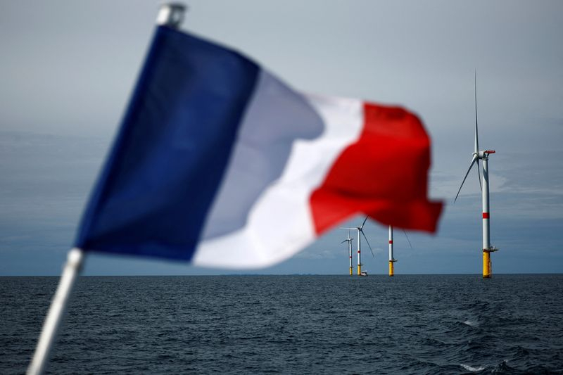 Un drapeau français devant les éoliennes du parc éolien offshore de Saint-Nazaire