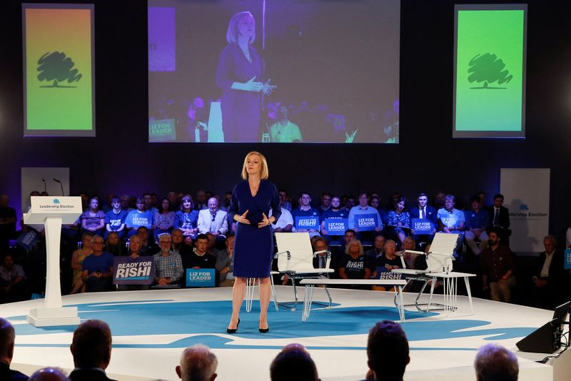LONDRES (Reuters) - La ministre des Affaires étrangères, Liz Truss, et l'ancien ministre des Finances, Rishi Sunak, candidats à la succession de Boris Johnson à la tête du Parti conservateur et du gouvernement britanniques, ont débattu jeudi de l'avertissement de la Banque d'Angleterre (BoE) d'une longue récession à venir.