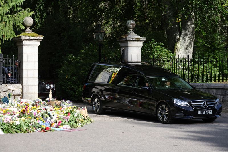 BALMORAL, Ecosse (Reuters) - Trois jours après le décès de la reine Elizabeth II, le corbillard royal a quitté dimanche le château de Balmoral, en Ecosse, à destination d'Edimbourg, un périple de six heures par les routes écossaises où se pressait une foule nombreuse.