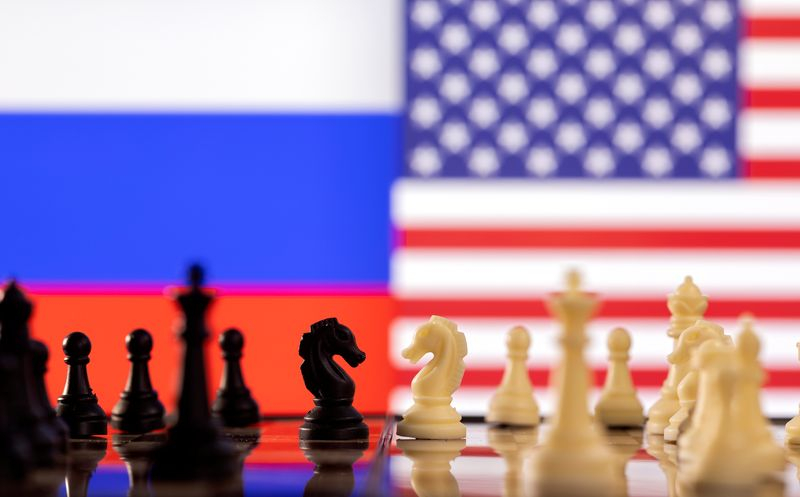 Une illustration montre les drapeaux russe et américain