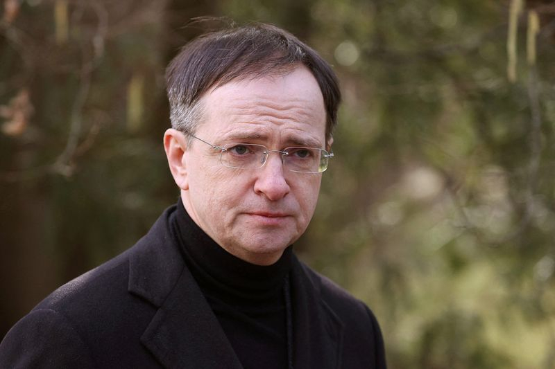 LONDRES (Reuters) - Les négociateurs russes et ukrainiens n'ont pas encore rédigé de projet d'accord de paix qui permette d'envisager des réunions au sommet, notamment entre Vladimir Poutine et Volodimir Zelenski, a déclaré dimanche le principal négociateur russe, alors que la guerre en Ukraine est entrée dans son 39e jour.