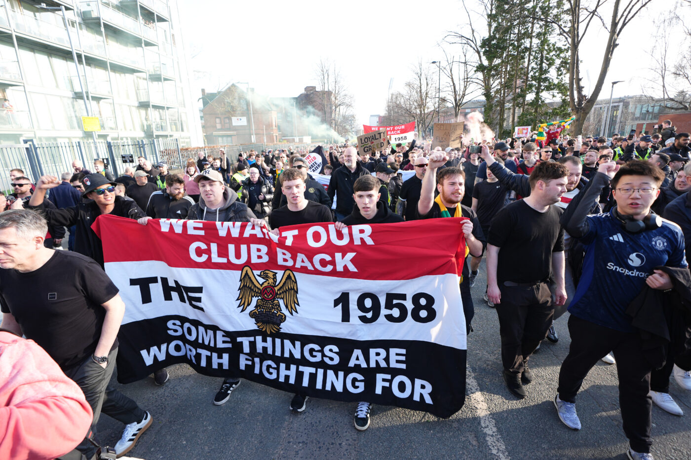 À quelques minutes du coup d’envoi du choc opposant leur équipe à Arsenal à Old Trafford, les supporters de Manchester United ont défilé pour afficher leur mécontentement face à la situation du club . Alors que l’équipe dirigée par Ruben Amorim coule peu à peu dans les tréfonds du classement de Premier League, les dirigeants sont dans le viseur des fans. Entièrement vêtus de noir, ce sont environ 5000 d’entre eux qui ont marché jusqu’au stade , arborant notamment une banderole avec le message suivant : « We want our club back / Some things are worth fighting for » (Nous voulons retrouver notre club / Certaines choses valent la peine de se battre pour elles, en VF). Une manifestation organisée à l’initiative du groupe de supporters The 1958 .…