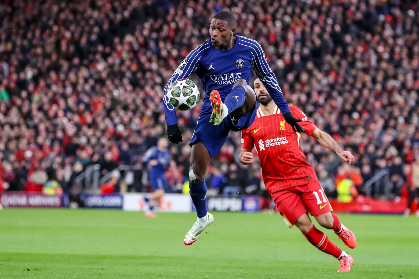 Si c’était sa dernière sortie en Ligue des champions (ou du moins avec un maillot rouge sur le dos), cette élimination risque de provoquer quelques cauchemars au cœur des prochaines nuits de Mohamed Salah. Des terreurs nocturnes qui auront un visage pour l’Égyptien, celui de Nuno Mendes. Près d’un an après avoir souffert le martyre face à Jadon Sancho en demi-finales, une mauvaise habitude lors des gros rendez-vous de C1 du PSG, le latéral portugais a régné sur son duel face au meilleur joueur d’Angleterre. Des ballons récupérés à la pelle, des interventions toujours bien senties et même un sauvetage devant sa ligne après quelques minutes à Anfield : à l’exception de cette saute de concentration sur le but de Harvey Elliott à l’aller, Mendes a étalé une palette défensive impressionnante. Les progrès qu’il a réalisés dans ce domaine sont colossaux.