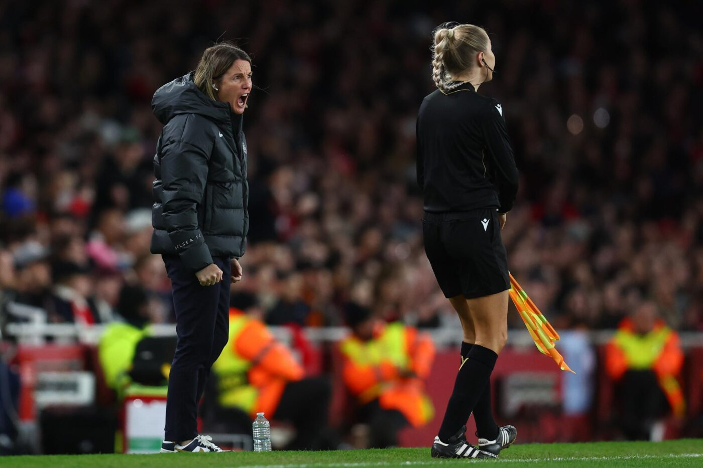 Doucement, non ? Hors d’elle sur un but refusé à Veerle Buurman peu avant la mi-temps d’Arsenal-Chelsea, en quarts aller de Ligue des champions, Sonia Bompastor a littéralement pété un câble . La retransmission télévisée a permis d’entendre des propos très virulents envers l’arbitre de la rencontre : « Elle est même pas late (en retard, NDLR) . Elle a pas sauté c’est tout. NO WAY ! » , a-t-elle crié de rage sur son banc de touche juste après la confirmation du VAR check.