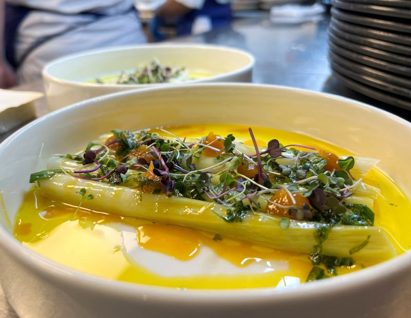 "Un produit de saison cultivé à moins de 50 kilomètres d'ici. On l'a simplement cuit dans son eau, car un poireau c’est 80% d'eau, on va le passer à la flamme, le décortiquer et le servir avec une vinaigrette à l'huile d’olive", dit le chef en saupoudrant le plat de "petites pousses d'herbes qui viennent d’un jardin bio du 20e arrondissement de Paris, livrées à vélo".