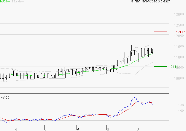 Le titre est orienté à la hausse. Il est au-dessus de sa moyenne mobile 50 jours. La moyenne mobile à 20 jours est supérieure à la moyenne mobile à 50 jours. Le support est à 104.88 EUR, puis à 100.83 EUR et la résistance est à 121.07 EUR, puis à 125.12 EUR.