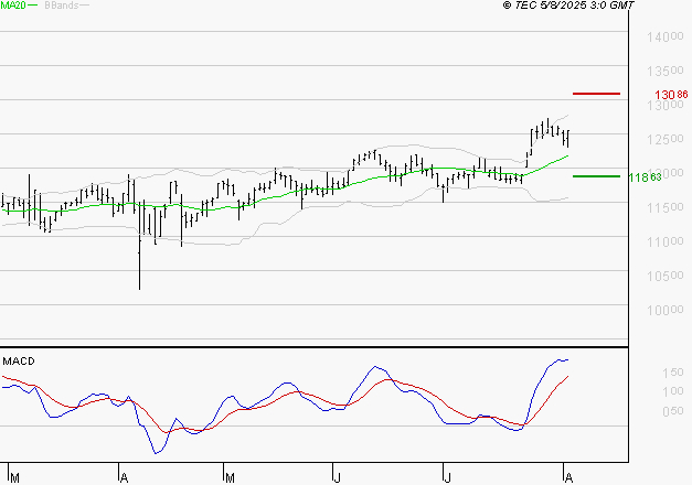 Le titre est orienté à la hausse. Il est au-dessus de sa moyenne mobile 50 jours. La moyenne mobile à 20 jours est supérieure à la moyenne mobile à 50 jours. Le support est à 118.63 EUR, puis à 115.57 EUR et la résistance est à 130.86 EUR, puis à 133.92 EUR.