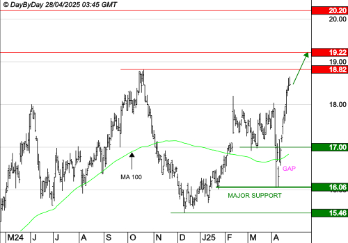 La tendance de fond est clairement orientée à la hausse. Les cours progressent toujours. Les objectifs suivants sont à 18,820 € et 19,220 €. La tendance serait invalidée sous le support à 16,065 €.