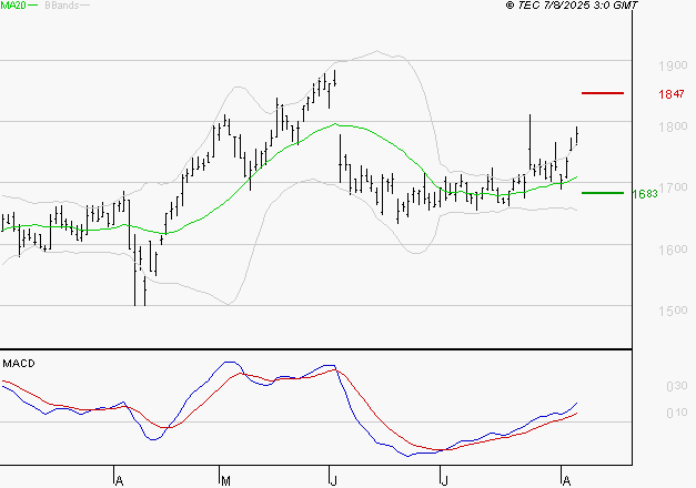 Le titre est en phase de reprise technique. Il est au-dessus de sa moyenne mobile à 50 jours. Le support est à 16.83 EUR, puis à 16.55 EUR; la résistance est à 18.47 EUR, puis à 18.74 EUR.