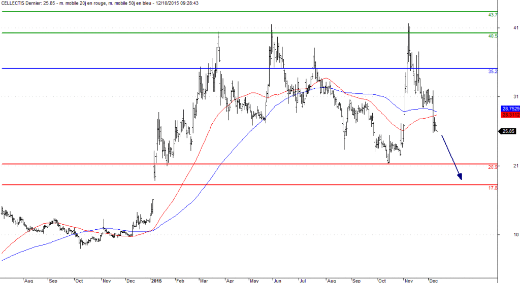 A l'inverse, si l'action Cellectis parvient à franchir le seuil de 35,20 euros , elle peut ensuite s'ouvrir la voie en direction de 40,50 voire 43,70 euros.