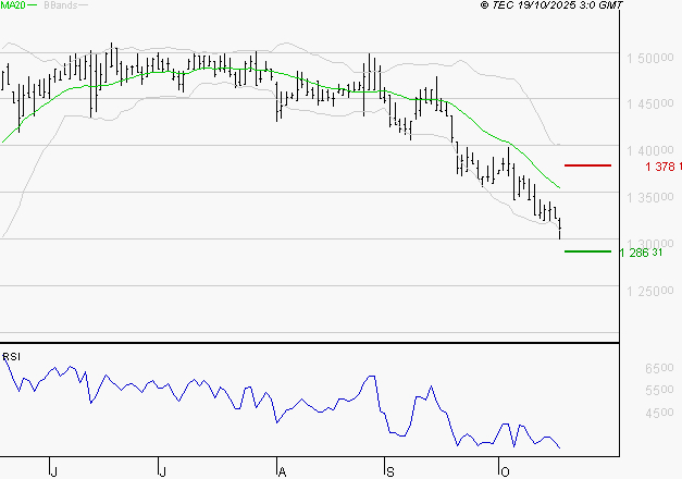 Le titre est orienté à la baisse. Il est sous sa moyenne mobile à 50 jours située à 1409.12 EUR. La moyenne mobile à 20 jours est inférieure à la moyenne mobile à 50 jours. Notre premier support est à 1286.31 EUR, puis à 1263.34 EUR et la résistance est à 1378.16 EUR, puis à 1401.13 EUR.