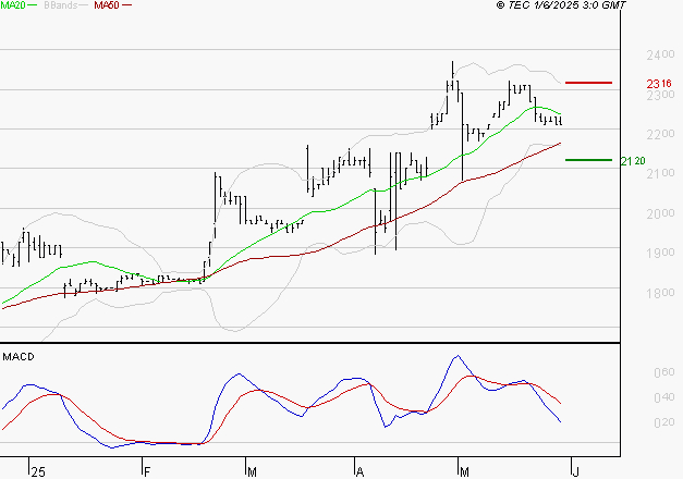 Après un plus haut à 23.1 EUR le titre corrige vers la moyenne mobile à 50 jours à 21.64 EUR : le comportement des cours sur ce niveau permettra d'envisager la poursuite du mouvement à moyen terme. Les premiers points d'achats (ou supports court terme) sont à 21.2 EUR et 20.81 EUR. Les résistances sont à 23.16 EUR et 23.55 EUR.