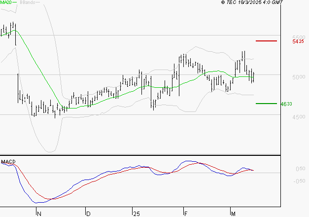 Le titre est orienté à la hausse. Il est au-dessus de sa moyenne mobile 50 jours. La moyenne mobile à 20 jours est supérieure à la moyenne mobile à 50 jours. Le support est à 46.33 EUR, puis à 44.06 EUR et la résistance est à 54.25 EUR, puis à 55.38 EUR.