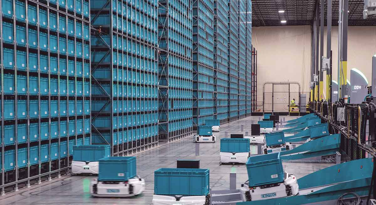 Au milieu des opérateurs occupés à remplir les cartons l’œil rivé sur l’écran où défile le contenu de chaque commande, une petite armée de robots s’active pour collecter les articles sur les kilomètres d’étagères.