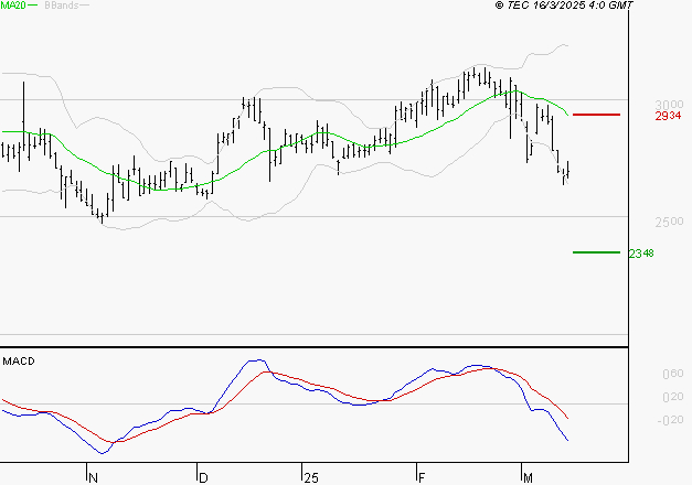 Le mouvement haussier semble être arrêté. Le titre est sous sa moyenne mobile à 50 jours située à 29.08 EUR. Le premier support est à 23.48 EUR, puis à 22.02 EUR et la résistance est à 29.34 EUR, puis à 30.81 EUR.