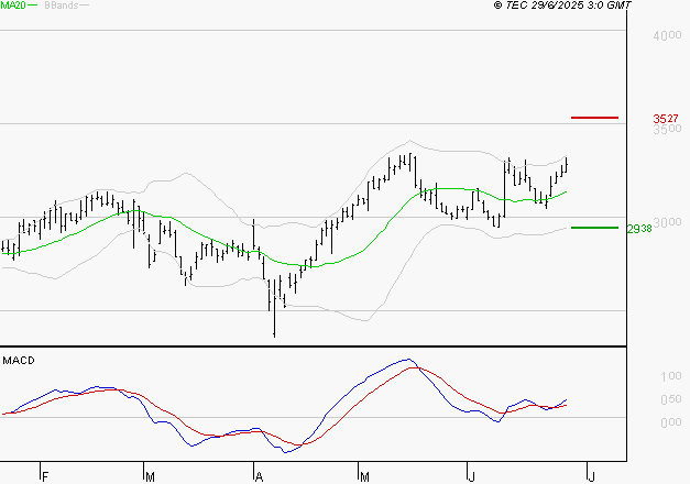 Le titre est orienté à la hausse. Il est au-dessus de sa moyenne mobile 50 jours. La moyenne mobile à 20 jours est supérieure à la moyenne mobile à 50 jours. Le support est à 29.38 EUR, puis à 27.42 EUR et la résistance est à 35.27 EUR, puis à 37.24 EUR.