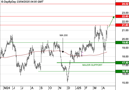 La tendance de fond est clairement orientée à la hausse. Les cours progressent toujours. Les objectifs suivants sont à 22,60 € et 23,50 €. La tendance serait invalidée sous le support à 12,38 €.