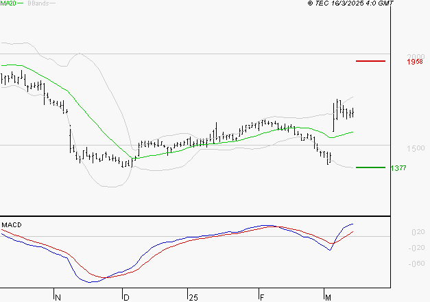Le titre est orienté à la hausse. Il est au-dessus de sa moyenne mobile 50 jours. La moyenne mobile à 20 jours est supérieure à la moyenne mobile à 50 jours. Le support est à 13.77 EUR, puis à 12.8 EUR et la résistance est à 19.58 EUR, puis à 20.55 EUR.