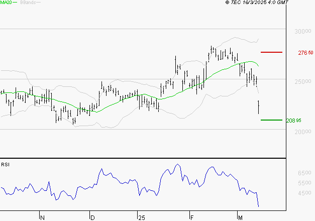 Le mouvement haussier semble être arrêté. Le titre est sous sa moyenne mobile à 50 jours située à 252.21 EUR. Le premier support est à 208.95 EUR, puis à 195.44 EUR et la résistance est à 276.5 EUR, puis à 290.01 EUR.