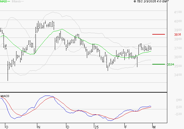 Le titre est orienté à la hausse. Il est au-dessus de sa moyenne mobile 50 jours. La moyenne mobile à 20 jours est supérieure à la moyenne mobile à 50 jours. Le support est à 35.04 EUR, puis à 34.56 EUR et la résistance est à 38.35 EUR, puis à 39.29 EUR.