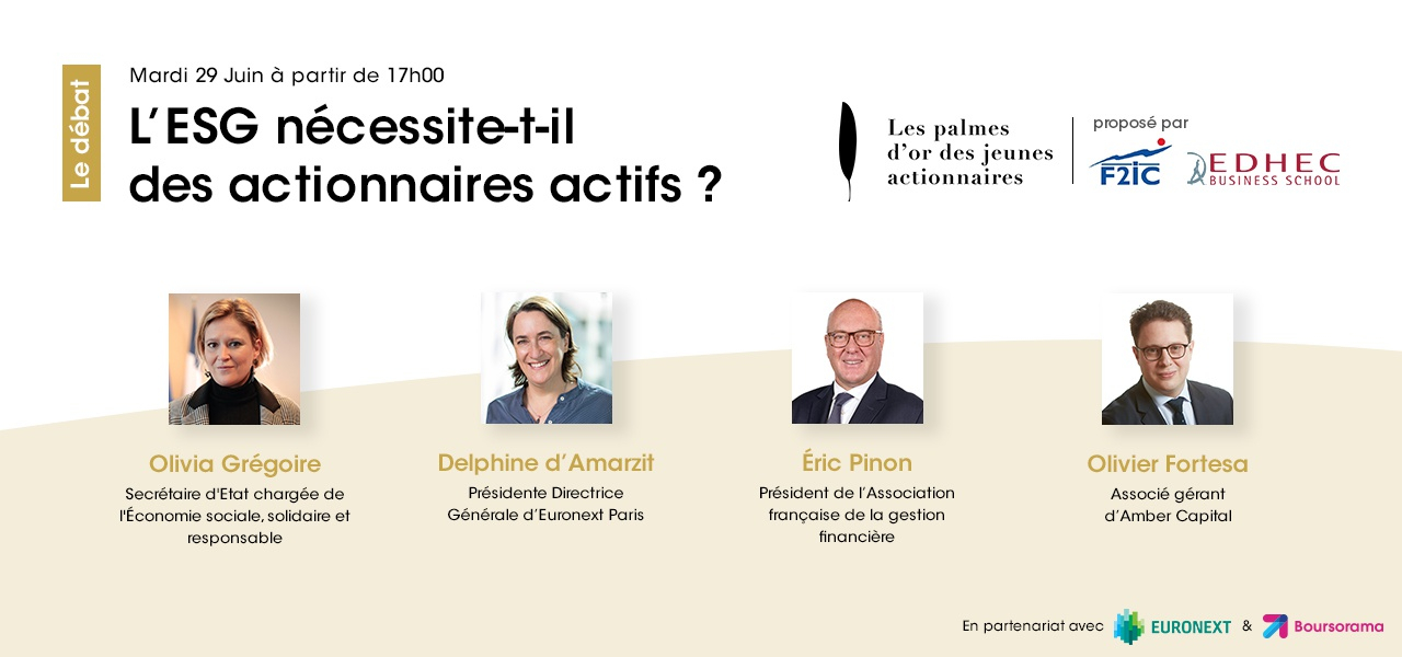 Son thème ? «L'ESG nécessite-t-il d'avoir des actionnaires actifs ?» . cette table ronde durera une heure avec la participation d'Olivia Grégoire, Secrétaire d'Etat chargée de l'Économie sociale, solidaire et responsable, de Delphine d'Amarzit, présidente d'Euronext Paris, d'Eric Pinon, président de l'Association française de la gestion financière, d'Olivier Fortesa, Associé gérant d'Amber Capital et de Daniel Haguet, professeur de finance à l'Edhec Business School.