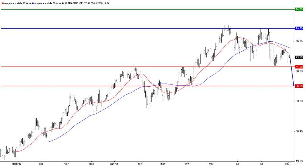Le cours du pétrole s'expose alors à un repli vers un premier support à 71 dollars. Si celui-ci est enfoncé à la baisse, un autre est situé un peu plus bas, à 66,65 dollars.