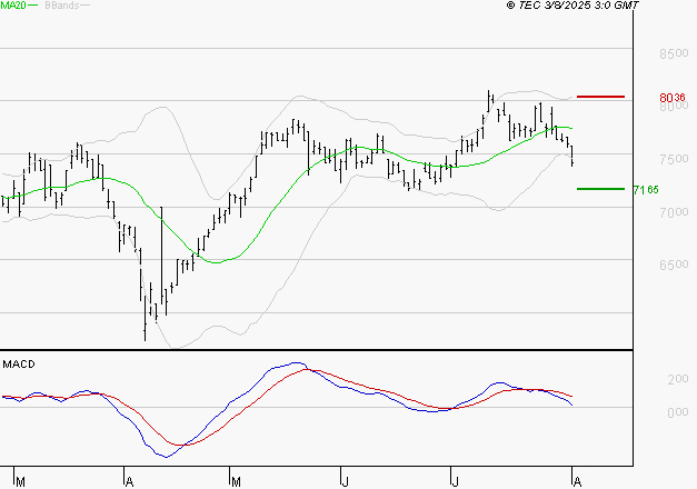 Le mouvement haussier semble être arrêté. Le titre est sous sa moyenne mobile à 50 jours située à 75.47 EUR. Le premier support est à 71.65 EUR, puis à 68.74 EUR et la résistance est à 80.36 EUR, puis à 83.26 EUR.