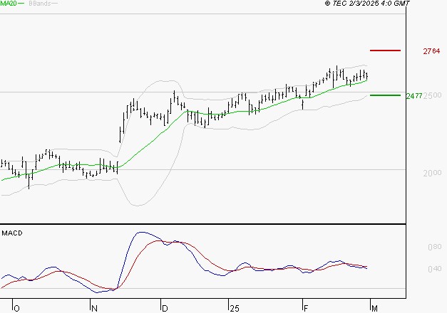 Le titre est orienté à la hausse. Il est au-dessus de sa moyenne mobile 50 jours. La moyenne mobile à 20 jours est supérieure à la moyenne mobile à 50 jours. Le support est à 24.77 EUR, puis à 24.3 EUR et la résistance est à 27.64 EUR, puis à 28.12 EUR.