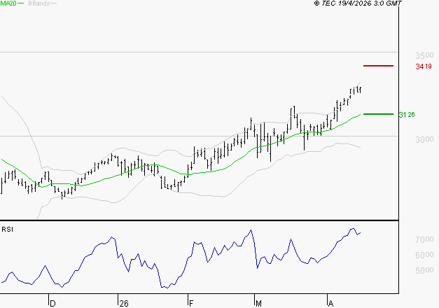 Le titre est orienté à la hausse. Il est au-dessus de sa moyenne mobile 50 jours. La moyenne mobile à 20 jours est supérieure à la moyenne mobile à 50 jours. Le support est à 31.26 EUR, puis à 30.28 EUR et la résistance est à 34.19 EUR, puis à 35.16 EUR.