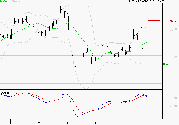 Le titre est orienté à la hausse. Il est au-dessus de sa moyenne mobile 50 jours. La moyenne mobile à 20 jours est supérieure à la moyenne mobile à 50 jours. Le support est à 48.5 EUR, puis à 47.19 EUR et la résistance est à 56.36 EUR, puis à 57.67 EUR.