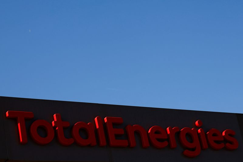Le logo de la compagnie pétrolière et gazière française TotalEnergies est visible sur une station-service à Drancy