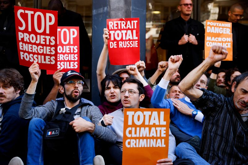 PARIS (Reuters) - L'assemblée générale de TotalEnergies a très largement validé mercredi la stratégie du groupe en matière de climat, alors que des militants écologistes emmenés notamment par Greenpeace ont tenté sans succès d'empêcher la réunion pour demander le retrait de l'entreprise de Russie et la fin de ses projets pétroliers et gaziers.