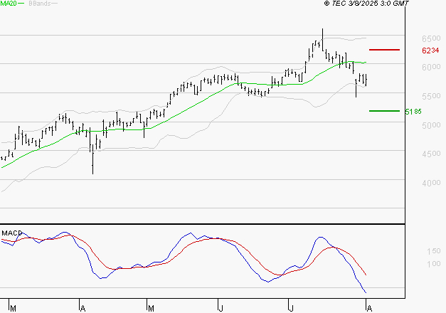 Le mouvement haussier semble être arrêté. Le titre est sous sa moyenne mobile à 50 jours située à 58.16 EUR. Le premier support est à 51.85 EUR, puis à 49.75 EUR et la résistance est à 62.34 EUR, puis à 64.43 EUR.