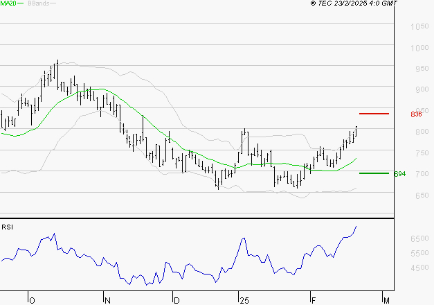 Le titre est orienté à la hausse. Il est au-dessus de sa moyenne mobile 50 jours. La moyenne mobile à 20 jours est supérieure à la moyenne mobile à 50 jours. Le support est à 6.94 EUR, puis à 6.59 EUR et la résistance est à 8.36 EUR, puis à 8.71 EUR.