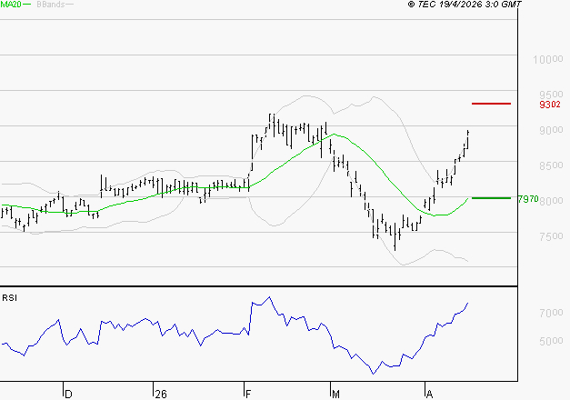 Le titre est en phase de reprise technique. Il est au-dessus de sa moyenne mobile à 50 jours. Le support est à 79.7 EUR, puis à 75.26 EUR; la résistance est à 93.02 EUR, puis à 97.46 EUR.