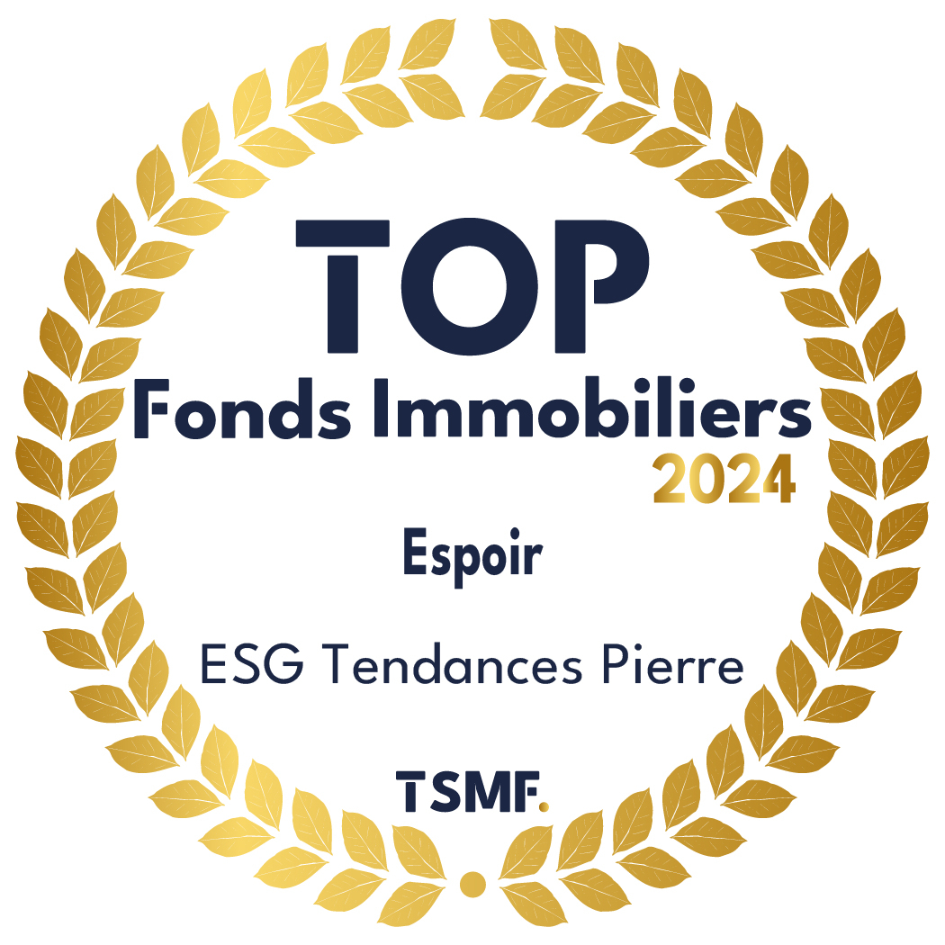 Nous sommes ravis d'avoir remporté le Top D'Or 2024 pour notre SC ESG Tendances Pierre dans la catégorie Espoir lors des TOP Assurance Vie et Fonds Immobiliers 2024 organisés par TSMF – Tout Sur Mes Finances. L'objectif des TOP Fonds Immobiliers est de récompenser les meilleurs fonds immobiliers grand public référencés dans les contrats d'assurance vie et les PER proposés aux particuliers (hors SCPI, hors Sicav et FCP). Ce prix vient récompenser les bons résultats 2023 de ESG Tendances Pierre : - 6,14 % de performance en 2023, la positionnant parmi les meilleurs UC immobilières de l'année. - 97 millions d'euros d'encours à fin 2023.