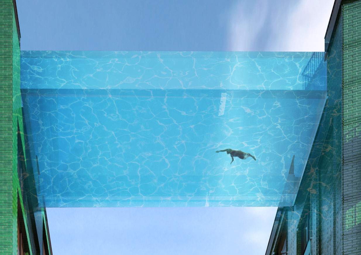 Baptisée Sky Pool, cette piscine relie deux tours du programme Embassy Gardens dans le quartier londonien de Battersea. Et de fait, ce bassin dans le ciel donnent presque autant la sensation de voler que de nager. Les nageurs privilégiés peuvent parcourir les 25 mètres du bassin extérieur suspendus à 35 mètres au-dessus du sol. La piscine a été conçue par le cabinet HAL architects et a été réalisée avec d'énormes panneaux d'acrylique (voir diaporama). Si le projet fait malgré tout grincer des dents, ce n'est pas pour de quelconques ratés techniques mais plutôt car cet équipement restera réservé à un petit nombre.