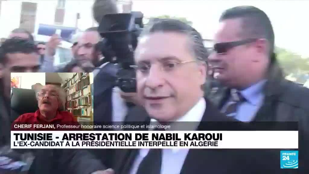 Nabil Karoui, président du parti Qalb Tounes, arrivé second à la présidentielle de 2019 en Tunisie, a été arrêté dimanche en Algérie, ainsi que son frère député, ont annoncé des médias tunisiens. Fondateur de la chaîne privée tunisienne Nessma TV, qui appartient en partie à Silvio Berlusconi, ancien chef du gouvernement italien, M. Karoui est poursuivi depuis 2017 dans le cadre d'une affaire de blanchiment d'argent et fraude fiscale. Pour évoquer cette arrestation et le contexte politique en Tunisie, France 24 a contacté Cherif Ferjani, Professeur honoraire de Science politique et d'Islamologie de l'Université Lyon 2. Pour M. Ferjani, l'homme d'affaires et politique tunisien Nabil Karoui est "avant tout un corrompu". M. Ferjani cite l'exemple de "la chaîne de télévision Nessma qui a été lancée sous le règne du (président déchu) Ben Ali en collaboration avec (l'ancien PM italien controversé Silvio) Berlusconi". M. Ferjani souligne que "c'était un moyen pour lui de faire campagne politique et d'arriver au pouvoir pour obtenir l'immunité (pour) lui et son frère".