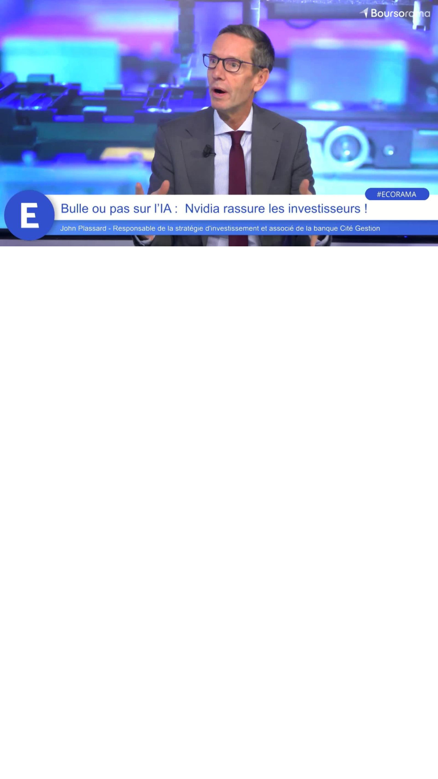 Suspense dissipé : Nvidia a une nouvelle fois rassuré les marchés. Avec un bénéfice trimestriel en envolée et des prévisions solides pour la fin d’année, le géant mondial des puces IA balaie pour l’instant les craintes de surchauffe. La demande reste explosive, son carnet de commandes bien orienté, et Jensen Huang, le président, ne voit aucun signe d’essoufflement. De quoi conforter une valorisation stratosphérique, même si la concentration extrême du marché américain continue de faire planer un risque sur l’ensemble des Bourses mondiales. L'analyse de John Plassard, responsable de la stratégie d'investissement et associé de la banque Cité Gestion. Ecorama du 20 novembre 2025, présenté par David Jacquot sur Boursorama.com