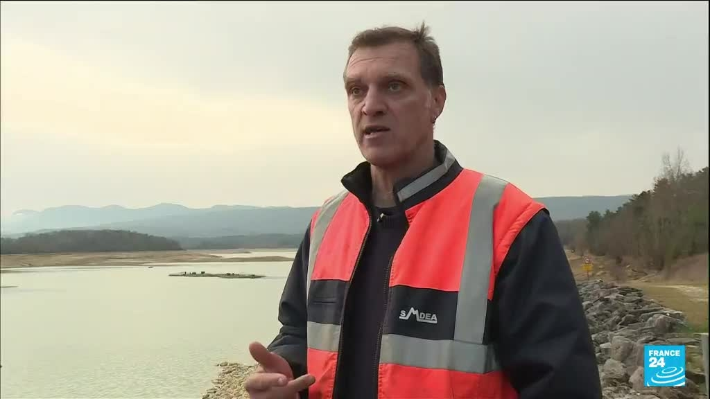 Le lac artificiel de Montbel, dans l'Ariège, est quasiment à sec, mardi 21 février. Le déficit en eau est présent depuis neuf mois, après un été caniculaire et un hiver sec.