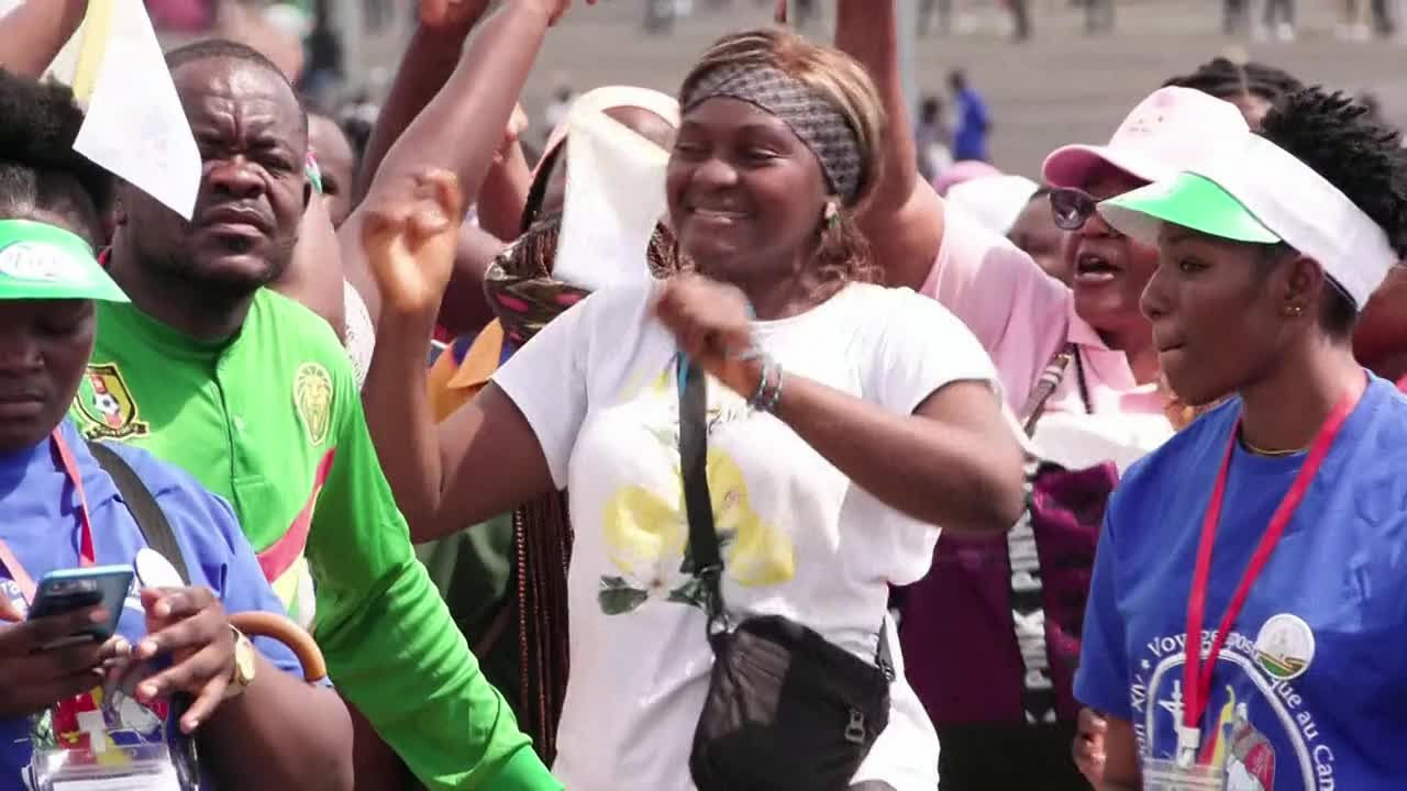Le pape Léon XIV arrive en papamobile au stade de Douala pour une grande messe en plein air, au troisième jour de sa visite au Cameroun.