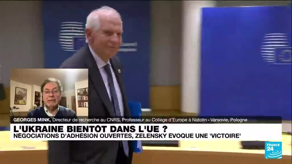Les dirigeants de l'UE ont décidé d'ouvrir des négociations d'adhésion avec l'Ukraine, une décision aussitôt saluée comme une "victoire" par son président Volodymyr Zelensky. Les dirigeants de l'UE, réunis en sommet à Bruxelles, ont décidé "d'ouvrir des négociations d'adhésion avec l'Ukraine et la Moldavie", a annoncé le président du Conseil européen Charles Michel. "Un signal clair d'espoir pour les citoyens de ces pays et pour notre continent", a-t-il ajouté. Cette décision, qui semblait pourtant hors d'atteinte en raison de l'opposition de la Hongrie, a aussitôt été saluée par M. Zelensky: "C'est une victoire pour l'Ukraine, pour toute l'Europe, une victoire qui motive, inspire et rend plus fort", a-t-il lancé sur X. Pour une analyse approfondie et une perspective plus profonde de la décision historique de l'UE de d'ouvrir des négociations d'adhésion avec l'Ukraine, Claire Hilderbrandt de FRANCE 24 reçoit Georges Mink, Directeur de recherche au CNRS émérite à l’Institut des Sciences sociales du politique, professor au Collège d’Europe (Natolin-Varsovie) et président de l’ICCEES (International Council for Central and East European Studies).