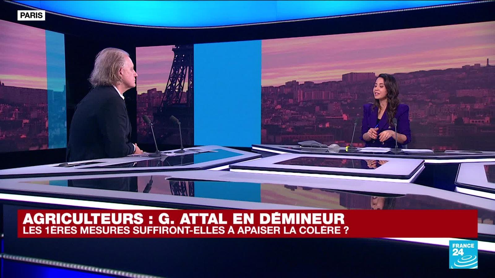 Peut-il éteindre la colère du monde agricole ? Le Premier ministre français, Gabriel Attal annonce, vendredi 26 janvier, dix mesures de simplification immédiates" pour répondre aux agriculteurs qui manifestent depuis une semaine. Parmi les autres annonces phares du Premier ministre, la fin à la "hausse du gazole non routier agricole, ou la mise en place sanctions très lourdes" contre des entreprises qui ne respectent pas la loi Egalim. Le décryptage de cette prise de parole avec le politologue Jen-Christophe Gallien en plateau et notre journaliste Karim Yahiaoui, depuis le péage de Saint-Arnoult-en-Yvelines.