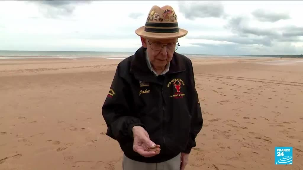 L’Américain Jake Larson, 99 ans, était à Omaha Beach en Normandie, pour le 78e anniversaire du D-Day. Il participe à la cérémonie de commémoration, mardi 6 juin 2023, ayant participé au Débarquement sur les côtes normandes le 6 juin 1944. Reportage France 3.