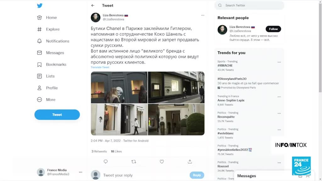 Des collages nazis pour dénoncer des sanctions appliquées par Chanel? information fournie par France 24 12/04/2022 à 23:15