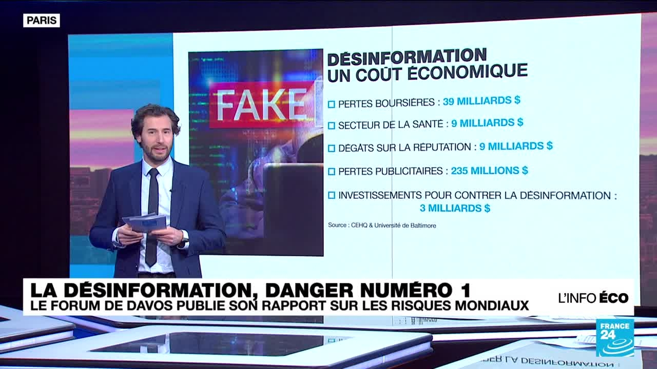 Selon le Forum économique mondial, la désinformation est le plus gros danger pour l'économie mondiale dans les deux prochaines années, devant les guerres, le climat ou l'inflation. La désinformation coûte de plus en plus cher aux États et aux entreprises. Elle pourrait avoir des conséquences dévastatrices dans un contexte d'élections majeures en 2024, rappelle ce rapport qui s'appuie sur les points de vue de 1 400 experts à quelques jours de l'ouverture du Forum de Davos, en Suisse.